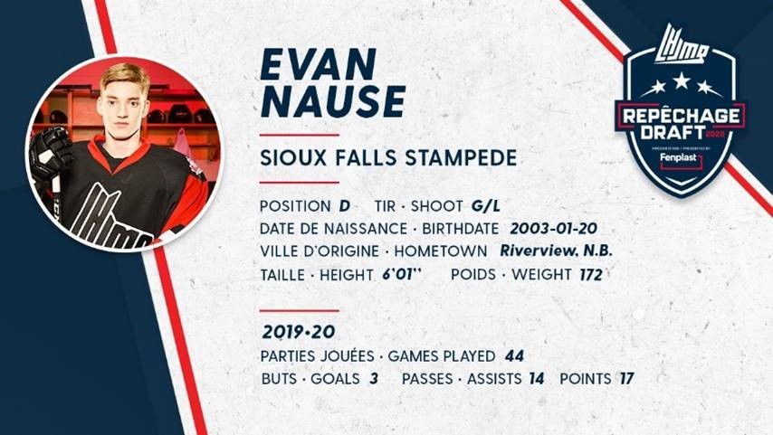 Défenseur gaucher de 6’1, 172 livres, âgé de 17 ans et originaire de Riverview au Nouveau-Brunswick, il a évolué la saison dernière avec le Stampede de Sioux Falls de la USHL où il a marqué trois buts et récolté 14 passes pour 17 points en 44 parties. Avant de joindre les rangs de la USHL, Evan Nause a joué son hockey avec Bishop’s College School U-16, les Hounds de Notre-Dame et Newbridge Academy.