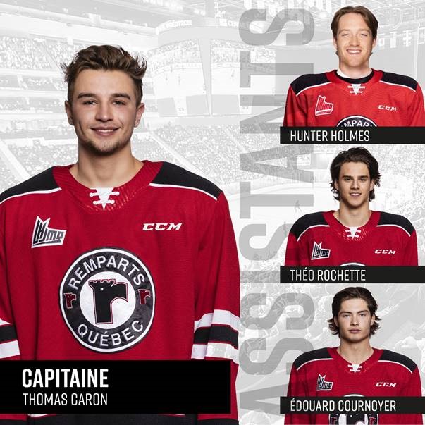 Sélectionné en quatrième ronde (62e au total) lors de la séance de sélection de la LHJMQ en 2016, le l’ailier gauche de 20 ans, Thomas Caron, est nommé capitaine de l’équipe. Originaire de Candiac, Québec, il en est à sa cinquième saison dans l’organisation. Lors des saisons 2016-2017 et 2017-2018, il a partagé son temps entre les Remparts et les Inouk de Granby de la Ligue de hockey junior AAA du Québec. Depuis 2018, il porte les couleurs de l’équipe et à ce jour, il a marqué 19 buts, obtenu 31 passes pour 50 points en 116 parties. Il a d’ailleurs connu sa meilleure saison en carrière l’an dernier, alors qu’il a réussi 11 buts et cumulé 16 passes pour 27 points. Caron sera entouré de trois assistants, soit les joueurs de centre Hunter Holmes, vétéran de 20 ans et Théo Rochette, âgé de 18 ans, de même que du défenseur de 18 ans, Édouard Cournoyer.