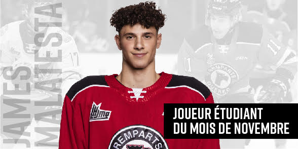 Québec, le mercredi 2 décembre 2020 — La direction des Remparts de Québec, par l’entremise de son conseiller pédagogique, M. Simon Tremblay, a annoncé aujourd’hui que le joueur de centre James Malatesta avait été nommé à titre de deuxième récipiendaire du titre de joueur-étudiant pour la saison 2020-2021 et ce, pour le mois de novembre 2020. Les résultats et l’attitude générale sont considérés pour déterminer le gagnant.