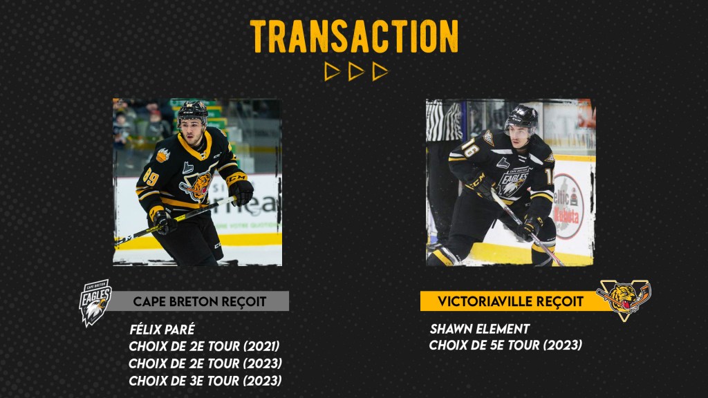 Victoriaville, le 30 décembre 2020 – Le directeur général des Tigres Kevin Cloutier a effectué une transaction avec les Eagles du Cape Breton afin de faire l’acquisition du meilleur pointeur de la LHJMQ, Shawn Element !