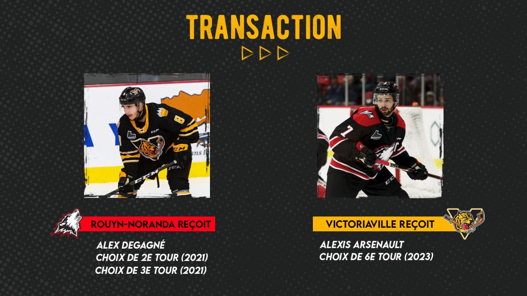 Victoriaville, le 10 janvier 2021 – Le directeur général des Tigres Kevin Cloutier a effectué une transaction pour obtenir le capitaine des Huskies de Rouyn-Noranda, Alexis Arsenault, et un choix de 6e ronde (ROU) en 2023.