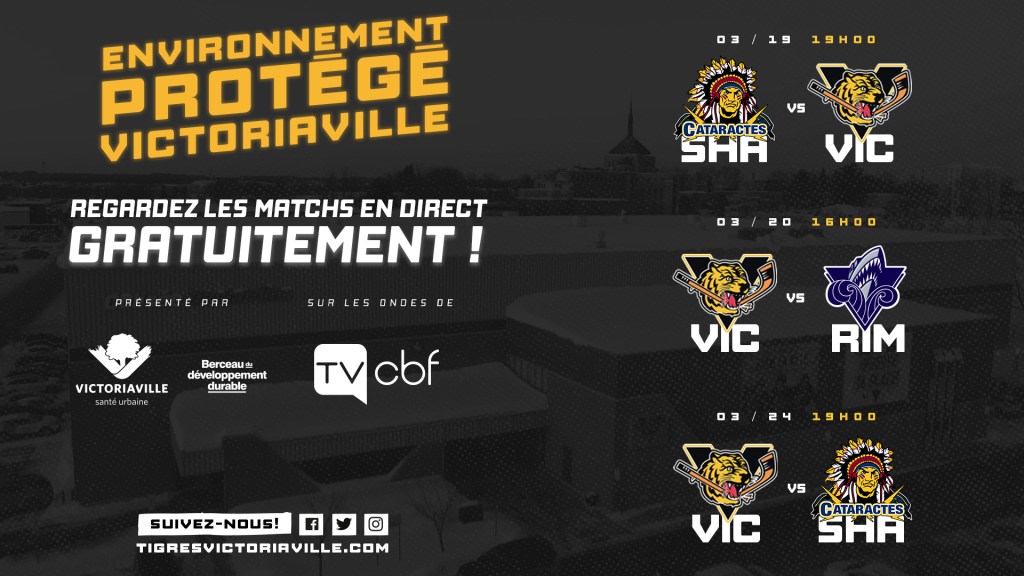 Victoriaville, le 12 mars 2021 – Grâce à l’appui financier de la Ville de Victoriaville, l’organisation des Tigres est heureuse d’annoncer que trois de ses quatre parties dans l’environnement protégé de Victoriaville seront présentées sur les ondes de la Télévision communautaire des Bois-Francs (TVCBF).