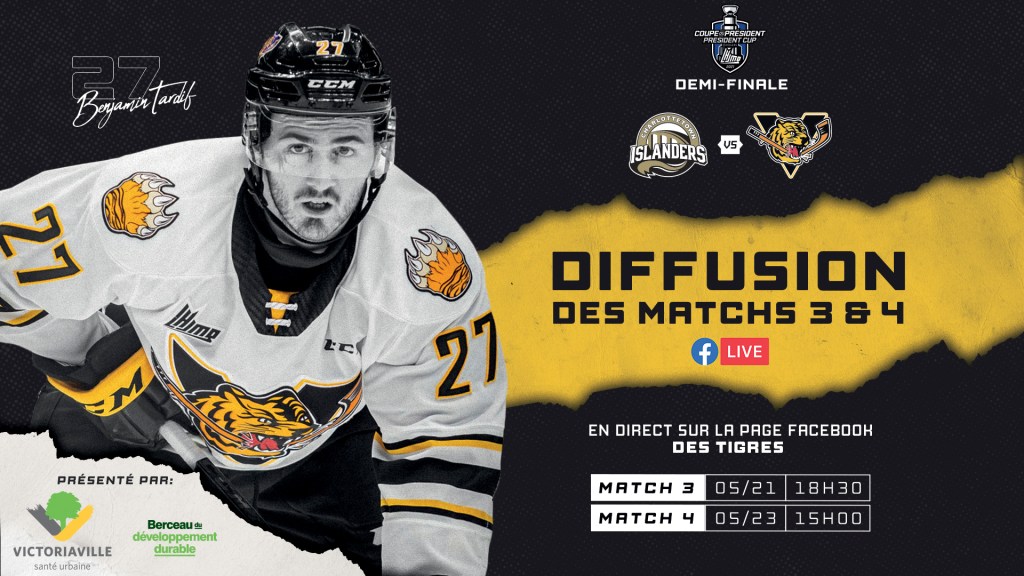 Victoriaville, le 20 mai 2021 – Grâce à l’appui financier de la Ville de Victoriaville, l’organisation des Tigres est heureuse d’annoncer que les matchs #3 et #4 de la ronde demi-finale des séries de la Coupe du Président 2021 seront présentés en direct sur la page Facebook de l’équipe !