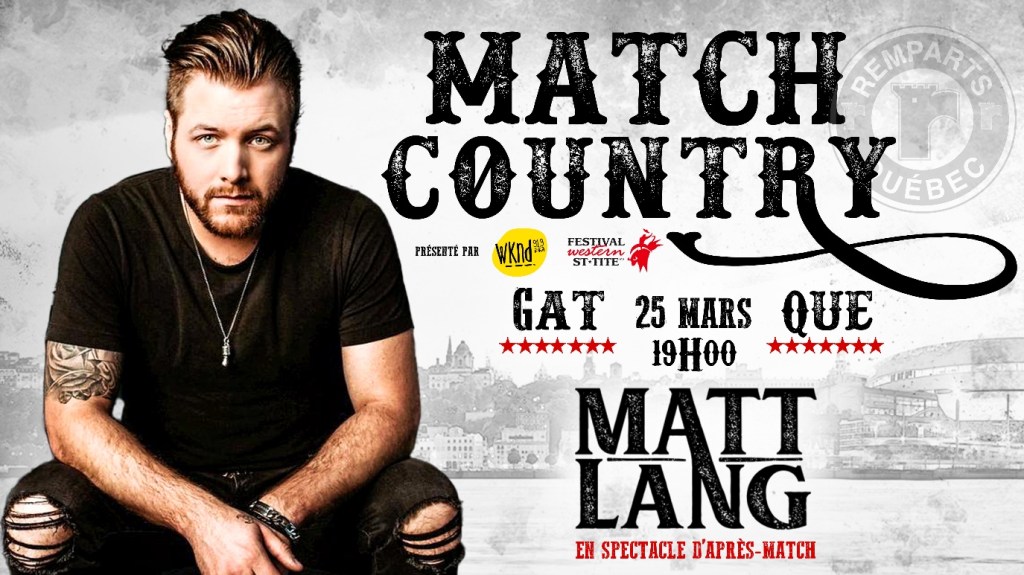 Québec, le lundi 14 mars 2022 – C’est le vendredi 25 mars, lors de la visite des Olympiques de Gatineau, que les Remparts de Québec, en collaboration avec WKND 91,9 et le Festival Western de St-Tite, tiendront un premier match thématique « country » et c’est le populaire chanteur québécois en pleine ascension, Matt Lang, qui viendra couronner cette soirée en offrant performance d’après-match, dans le hall d’entrée principal du Centre Vidéotron. Cette prestation sera exclusivement réservée aux amateurs qui auront fait l’achat de billets pour le match.
