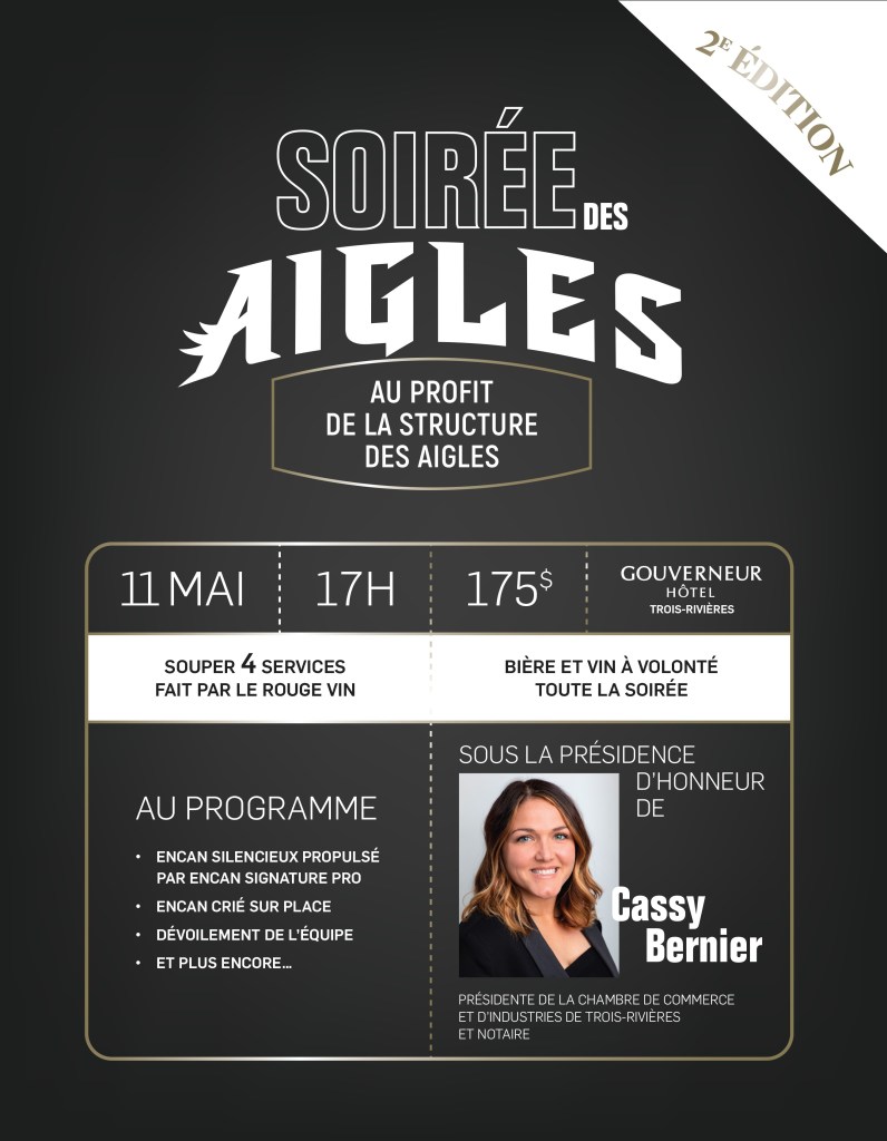Trois-Rivières, le 22 mars 2022 – Le 11 mai prochain se tiendra la deuxième édition de la « Soirée des Aigles » au profit de la structure des Aigles et du développement du baseball mineur à Trois-Rivières. Cette soirée qui débutera à 17h se tiendra à l’Hôtel Gouverneur de Trois-Rivières. Sous la présidence d’honneur de Cassy Bernier, présidente de la Chambre de commerce et d’industries de Trois-Rivières, et notaire chez Leblanc Martin Bernier, notaires et avocats, vous y retrouverez un souper gastronomique quatre services préparé par le Rouge Vin, bière et vin à volonté, un encan silencieux ainsi qu’un encan crié. L’organisation trifluvienne attend 200 personnes de la communauté d’affaires de la région. Pendant la soirée, l’organisation des Aigles dévoilera sa programmation de la saison 2022, la composition de l’équipe ainsi qu’un nouvel uniforme. Le coût de cette soirée est de 175$ par personne. Mot de la présidente d’honneur « Je suis très enthousiaste à l’idée de me joindre à l’équipe des Aigles à titre de présidente d’honneur de cet événement. Contribuer à la visibilité d’une organisation prônant la santé, l’accomplissement et le dépassement chez les jeunes est pour moi un honneur », explique-t-elle. « Les Aigles de Trois-Rivières, c’est une fierté régionale qui gagne à être connue. Joignez-vous à moi le 11 mai prochain et tout au long de la saison 2022, afin de vous aussi, faire partie du mouvement! » (André Butch Bouchard: albp@sympatico.ca) |