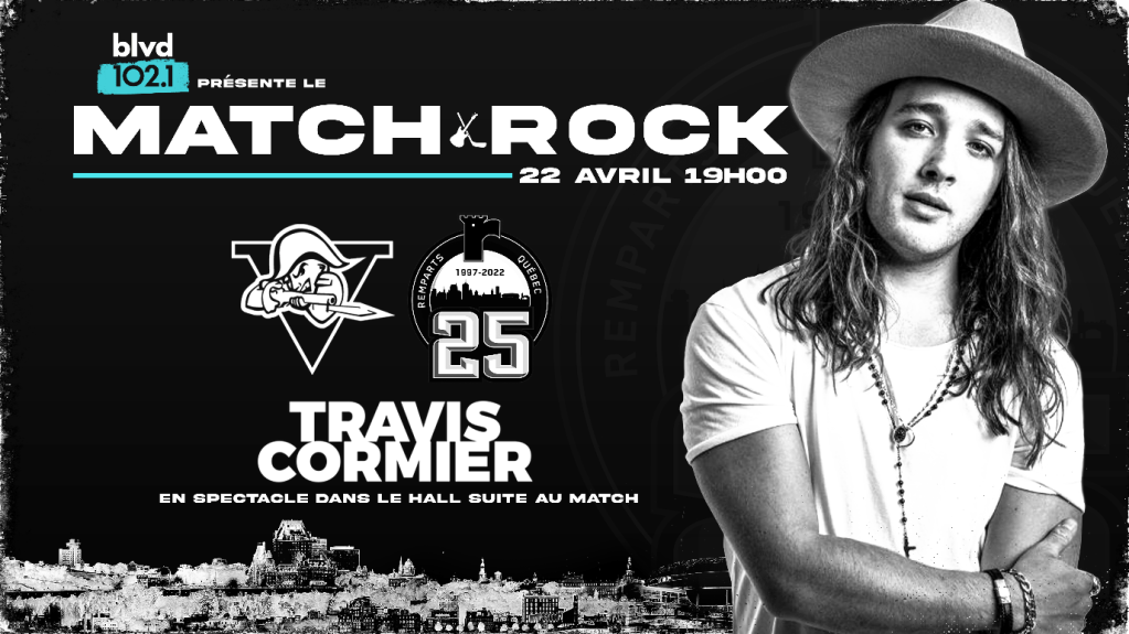 Québec, le mardi 12 avril 2022 – Le hockey et le rock seront à l’honneur lors du match du vendredi 22 avril prochain, alors que les Voltigeurs de Drummondville seront les visiteurs au Centre Vidéotron à compter de 19 heures. En collaboration avec BLVD 102,1, les Remparts tiendront un match thématique cette fois à saveur « rock ». Le populaire chanteur originaire de Moncton au Nouveau-Brunswick, Travis Cormier, viendra clore la soirée en offrant un spectacle d’après-match, dans le hall d’entrée principal du Centre Vidéotron. Les amateurs qui feront l’achat de billets pour la partie pourront assister en exclusivité à cette performance de fin de soirée.