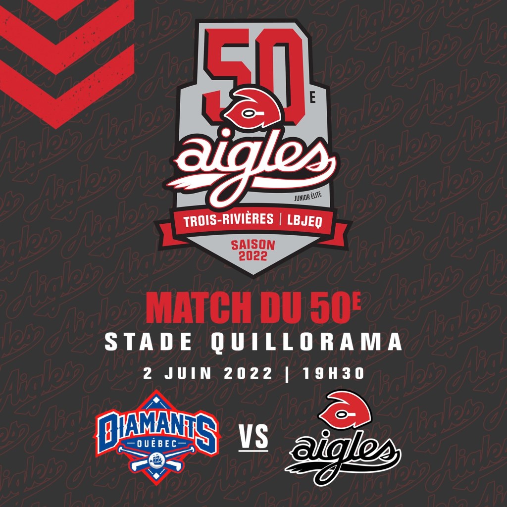 Trois-Rivières, le 1 juin 2022 – Jeudi le 2 juin, l’organisation des Aigles Junior Élite soulignera le 50e anniversaire du baseball mineur à Trois-Rivières au Stade Quillorama. Cette soirée de match débutera à 19h30 dans laquelle les Aigles affronteront leurs rivaux, les Diamants de Québec.