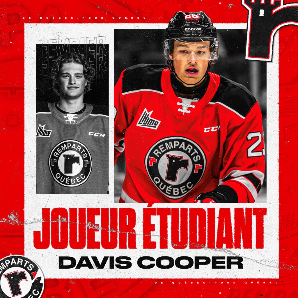 Québec, le mercredi 1er mars 2023 — Les Remparts de Québec, par l’entremise de sa coordonnatrice aux études, Marie-Pier Blouin et son conseiller pédagogique Simon Tremblay, ont annoncé aujourd’hui que le joueur d’avant Davis Cooper avait été choisi à titre de joueur-étudiant de l’équipe pour le mois de février 2023. Les résultats et l’attitude générale sont considérés pour déterminer le gagnant.