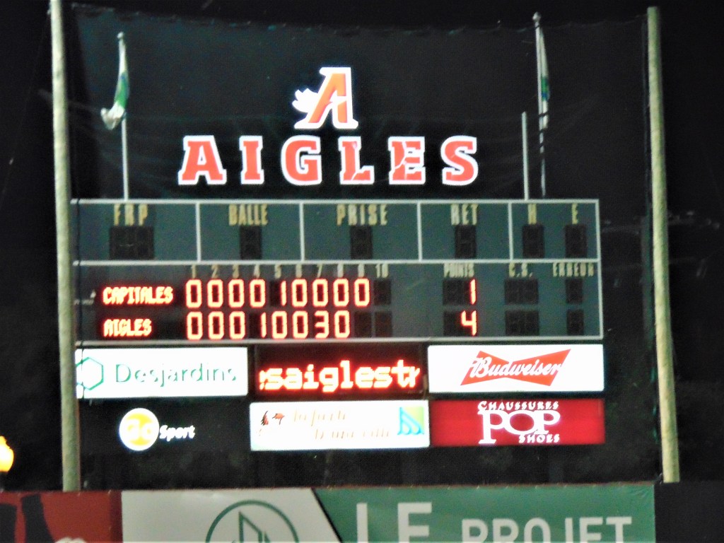 Mardi, c’était jour de fête au Stade Quillorama alors que l’on soulignait le dixième anniversaire de l’équipe en marge du premier match de la série contre les Capitales. Après un début de match tranquille où les deux équipes se sont analysées, c’est finalement Ricardo Sanchez qui a brisé l’égalité en fin de 4e manche en poussant Rodrigo Orozco à la plaque avec un simple. Dès la demi-manche suivante, Justin Gideon a claqué un circuit solo afin de niveler la marque 1 à 1. Nos Aigles n’allaient cependant pas laisser leurs adversaires ruiner cette soirée de célébration et L-P Pelletier se chargea de donner pour une ultime fois les devants à son équipe en fin de 7e en route vers une victoire de 4-1. Soulignons également le travail de Tyler Cornett qui n’a accordé aucun coup sûr et récolté 5 retraits au bâton en 3 manches de travail.