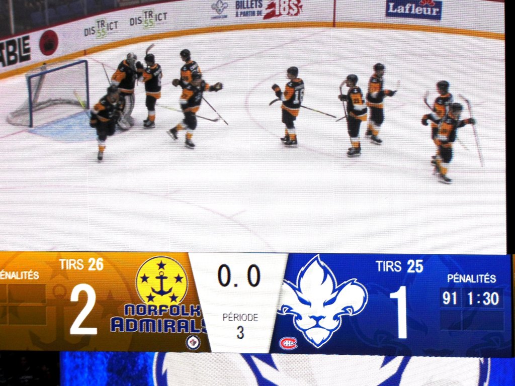 Trois-Rivières, le 20 avril 2024 – Les Lions de Trois-Rivières (club affilié aux Canadiens de Montréal) se sont inclinés par la marque de 2 à 1 contre les Admirals de Norfolk (Jets de Winnipeg et Hurricanes de la Caroline). Ils tirent donc de l’arrière 1-2 dans la série de 1er tour.