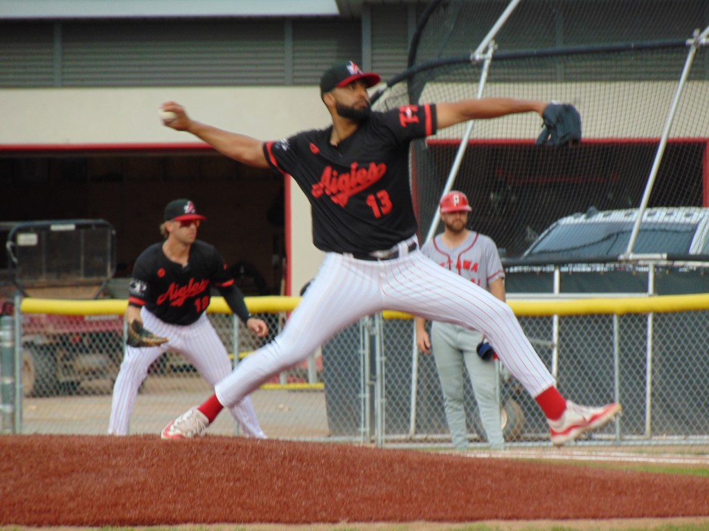 Les Aigles profitent d’un Jesen Therrien au sommet de son art, lui qui limite ses adversaires à seulement 2 coups sûrs après 7 manches de travail. Il connaîtra un rare faux pas dans ce match à la 8e manche, lorsque A.J. Wright expédie son tir loin dans la droite, une claque bonne pour 3 points.
