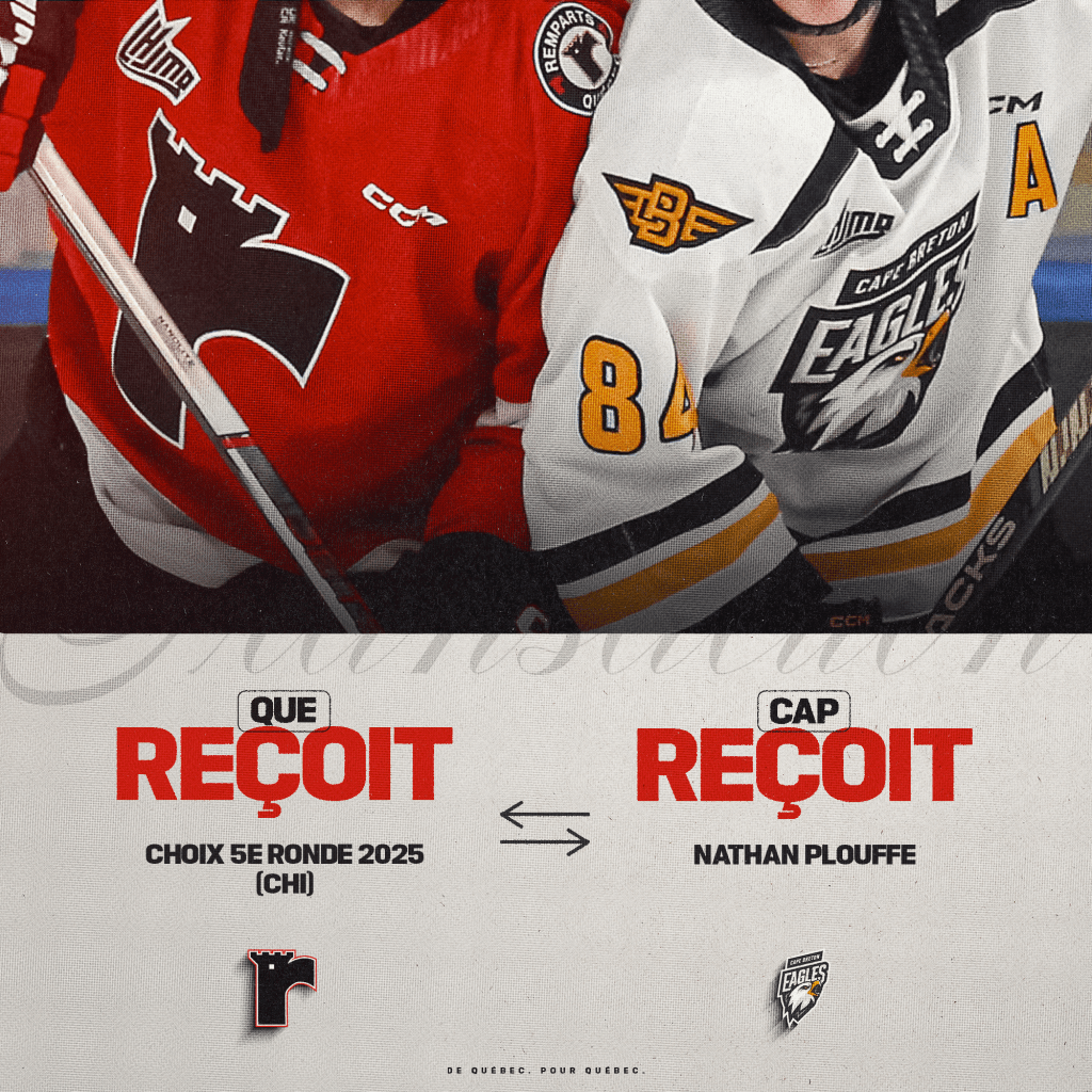 Québec, le samedi 4 janvier 2025 – Le directeur-gérant des Remparts de Québec, Simon Gagné, a annoncé ce matin une transaction avec les Eagles du Cape Breton. Les Remparts cèdent l’attaquant Nathan Plouffe aux Eagles, en retour d’un choix de 5e ronde (Chicoutimi) de la séance de sélection 2025.