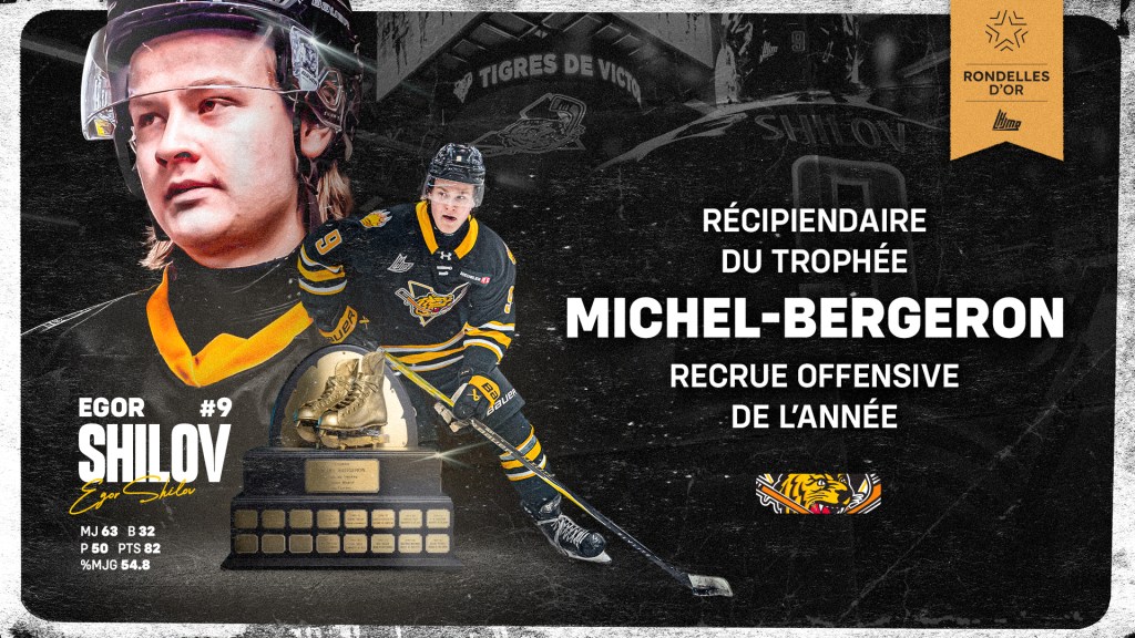 | Victoriaville, le 20 avril 2026 – La LHJMQ a annoncé récemment que l’attaquant des Tigres Egor Shilov était le récipiendaire du trophée Michel-Bergeron, remis à la recrue offensive de l’année ! Shilov a dominé toutes les recrues et terminé au septième rang des marqueurs de la LHJMQ avec 82 points en 63 matchs. Chez les joueurs de première année, il a terminé deuxième avec 32 buts et troisième avec 31 points en avantage numérique, en plus de remporter 54,8% de ses mises en jeu. Le Russe, qui disputait cette année sa saison de 17 ans, est considéré comme un espoir de première ronde au prochain repêchage de la LNH en juin prochain. Alexey Vlasov des Tigres, ainsi que l’attaquant de 16 ans des Sea Dogs de Saint John, Alexis Joseph, était les deux autres finalistes dans cette catégorie. (André Butch Bouchard: albp@sympatico.ca)(Source: L.P. Carbonneau: TIGERS) |
