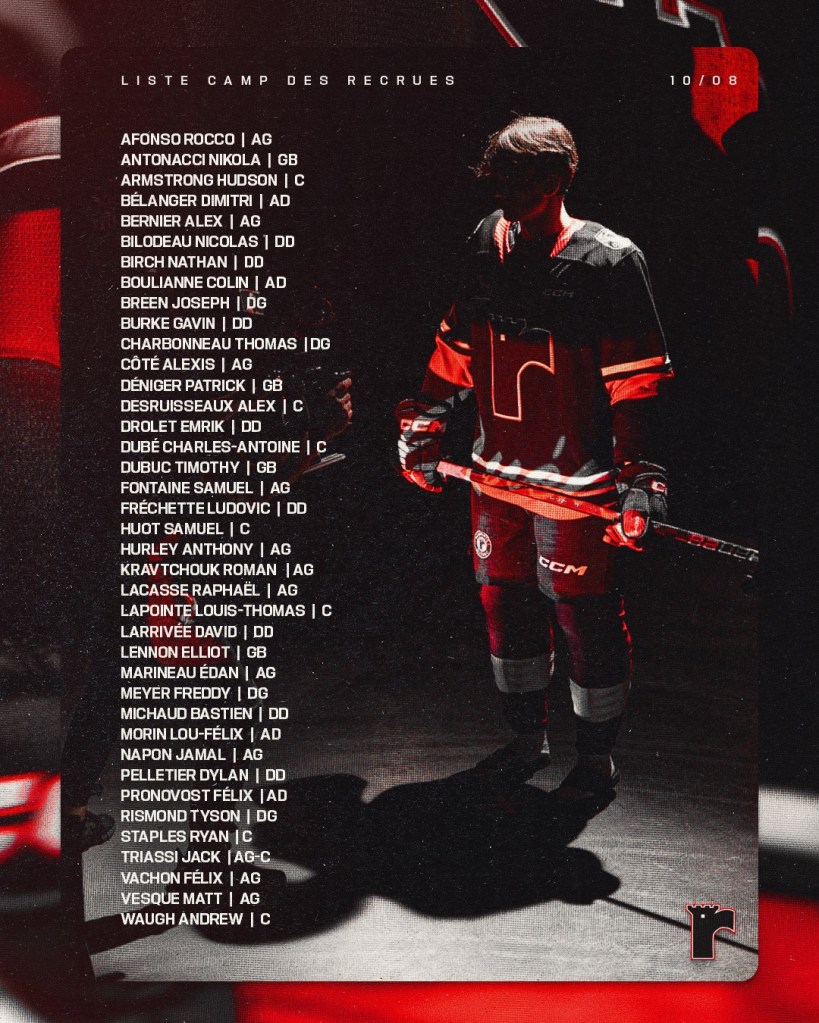 Québec, l août 2025 — C’est ce matin que les Remparts de Québec ont dévoilé tous les détails en vue de la présentation du 29e camp d’entraînement de l’équipe qui débutera le weekend prochain. Les joueurs qui sont invités à prendre part au camp des recrues se présenteront au personnel d’entraîneurs le dimanche 10 août et se poursuivra jusqu’au vendredi 15 août inclusivement, alors que les vétérans arriveront quant à eux pour le camp régulier à compter du samedi 16 août. Le camp des recrues et le début du camp régulier se dérouleront au Pavillon Guy-Lafleur et se transporteront ensuite au Centre Vidéotron à compter du 21 août. À noter que le public sera admis pour tous les entraînements qui seront présentés au Pavillon Guy-Lafleur.